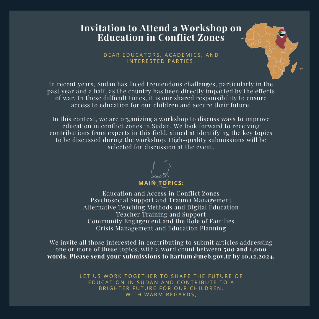 In this context, we are organizing a workshop to discuss ways to improve education in conflict zones in Sudan. We look forward to receiving contributions from experts in this field, aimed at identifying the key topics to be discussed during the workshop. High-quality submissions will be selected for discussion at the event.