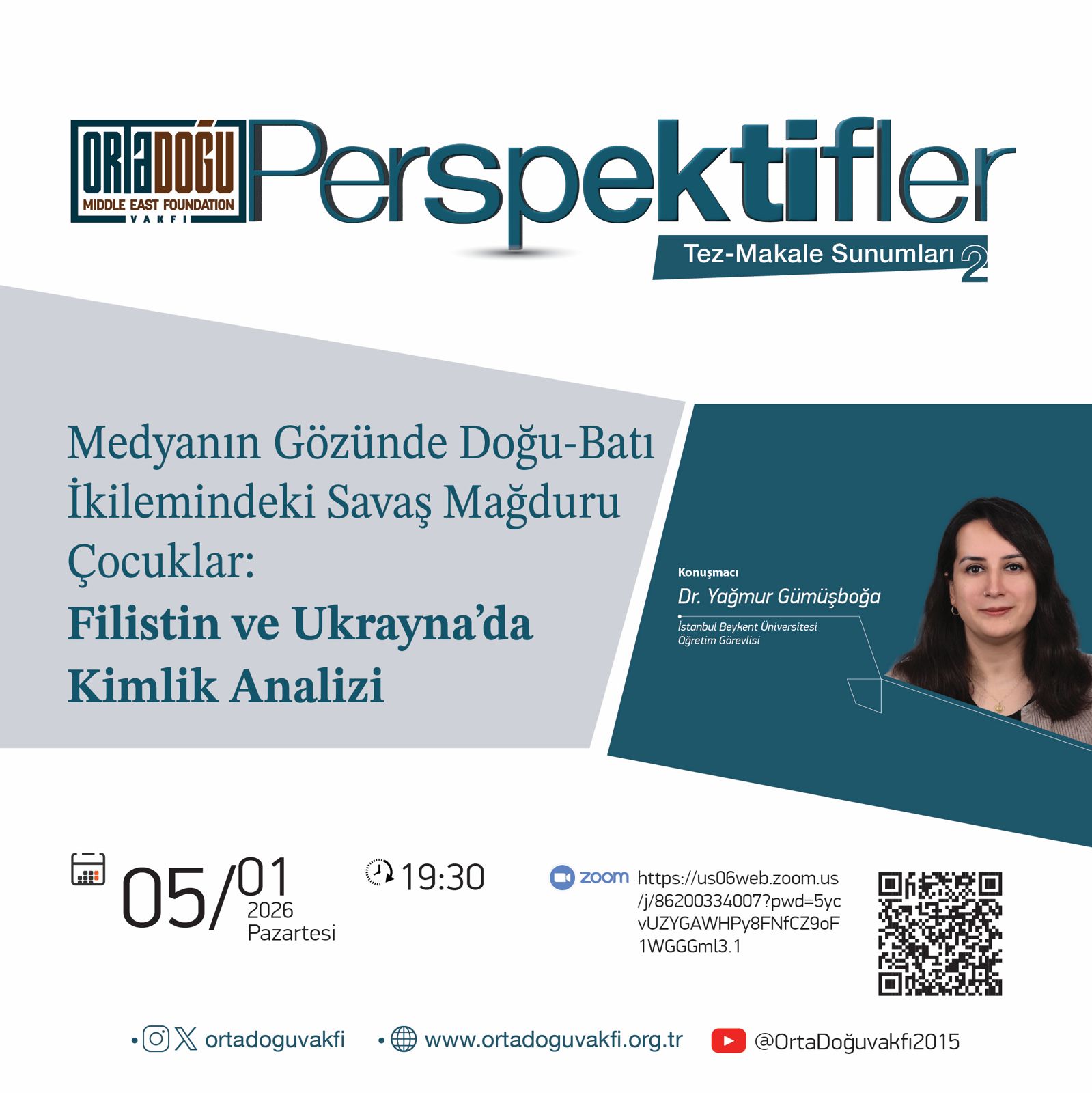 📍 Dr. Yağmur Gümüşboğa, “Medyanın Gözünde Doğu-Batı İkilemindeki Savaş Mağduru Çocuklar: Filistin ve Ukrayna’da Kimlik Analizi” başlıklı çalışmasında, Filistin ve Ukrayna örnekleri üzerinden savaş mağduru çocukların medya temsillerini, Doğu-Batı ikilemi bağlamında kimlik inşası ve söylem düzeyinde karşılaştırmalı olarak ele almaktadır.