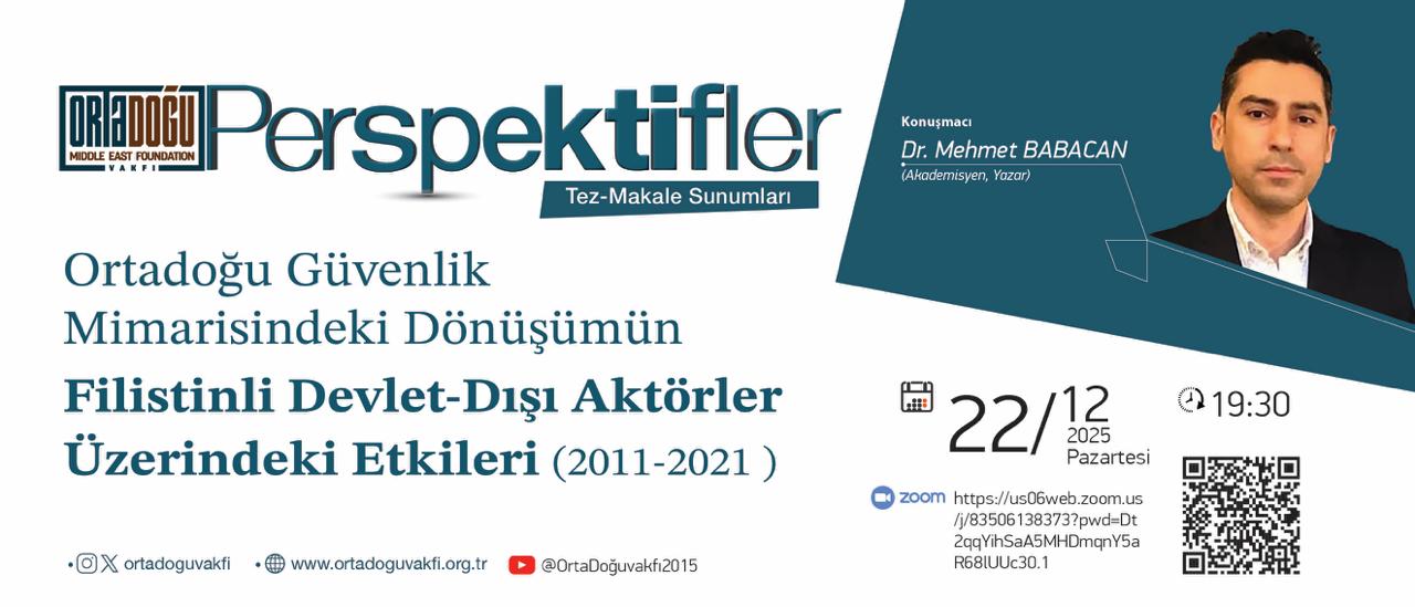 📍Dr. Mehmet Babacan “Ortadoğu Güvenlik Mimarisindeki Dönüşümün Filistinli Devlet-Dışı Aktörler Üzerindeki Etkileri (2011–2021)” başlıklı doktora tezinde, 2003 yılında Irak işgali ve 2011 yılında ise Arap Baharı sonrasında Ortadoğu’da yaşanan bölgesel dönüşümün Filistinli devlet-dışı aktörlerin politika, söylem ve stratejilerine nasıl etki ettiğini ele almaktadır.